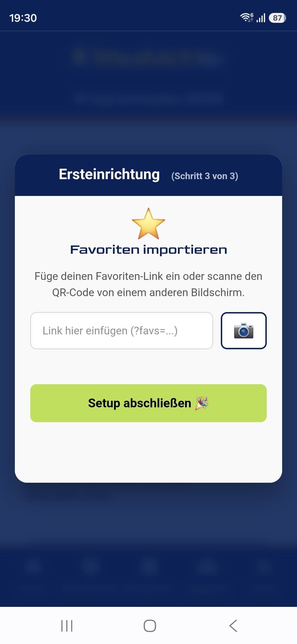 1. QR-Code scannen: Im dritten Schritt unseres Setup-Assistenten ("Favoriten importieren") klickst du einfach auf das [Kamera-Symbol].
